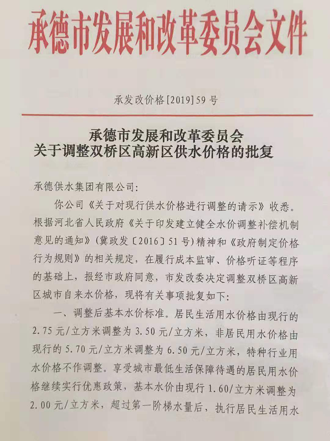 承德市發(fā)展和改革委員會(huì)關(guān)于調(diào)整雙橋區(qū)高新區(qū)供水價(jià)格的批復(fù) 承發(fā)改價(jià)格【2019】59號(hào)